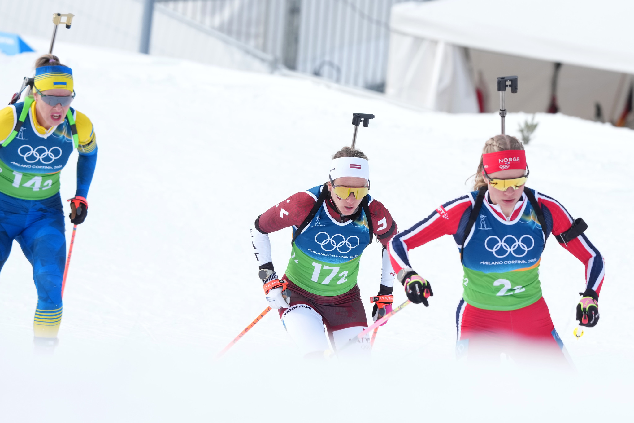 Latvijas sportistes, kuras mēroja trīs soda apļus un pielietoja 14 rezerves patronas, uzvarētājām zaudēja piecas minūtes un 36,7 sekundes.
